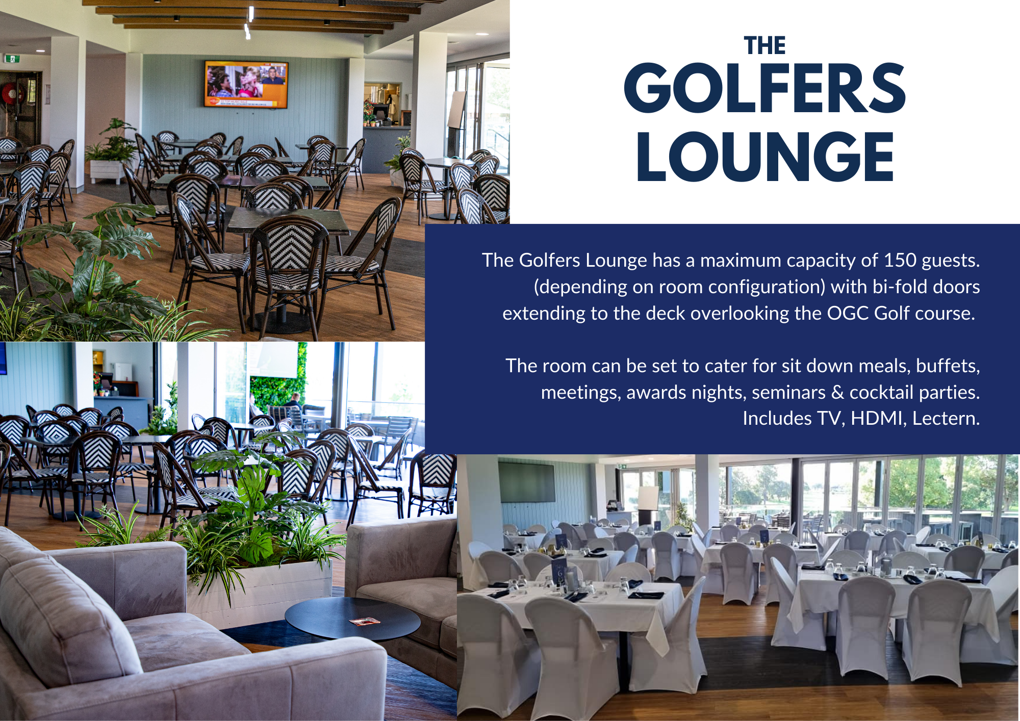 The Golfers Lounge has a maximum capacity of 150 guests. (depending on room configuration) with bi-fold doors extending to the deck overlooking the OGC Golf course.